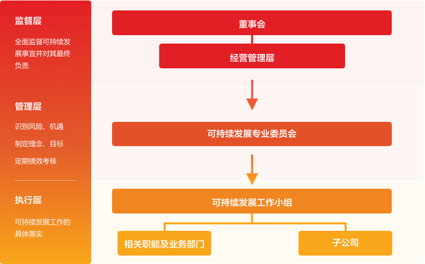 公司将可持续发展与公司战略发展相结合,通过建立健全可持续发展相关的组织体系、工作机制,统筹推进ESG工作的落实,识别及管理长期ESG风险及机遇,为公司健康发展打下基础。