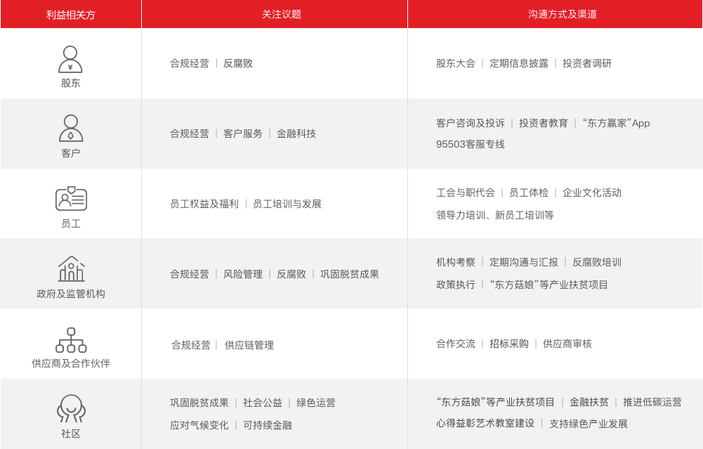 东方证券将回报社会的责任理念融入公司企业文化、战略方针及日常运营中,积极践行“为实体经济、社会财富管理提供优质综合金融服务;为员工创造美好生活;为股东、员工、社会实现物质与精神的双重回报”的使命,为各利益相关方创造可持续的综合价值。