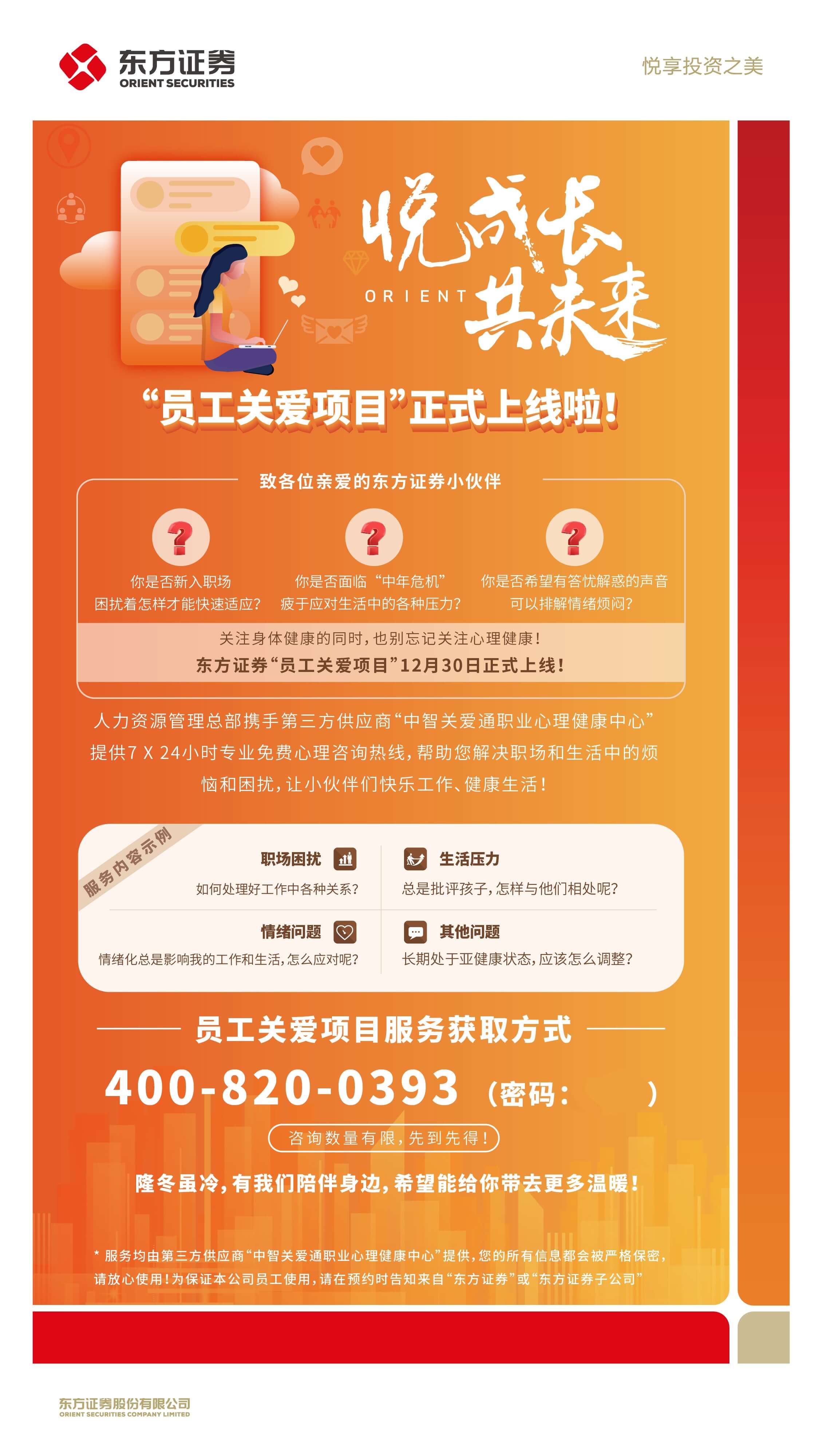 公司注重员工心理健康,设立“悦成长·共未来”员工职业心理健康关爱项目服务,为员工提供7X24小时专业免费咨询心理热线及公开课,缓解员工职场、生活压力,切实保障员工身体健康和心理健康。公司切实保护女性员工,充分保障处于生理期、结婚、孕期、产期、哺乳期内的女性员工的假期时长、工作安排、工资福利等,设有爱心妈咪小屋,持续为孕期、哺乳期妈妈提供人性化温馨服务,帮助员工更好协调处理工作与家庭责任。